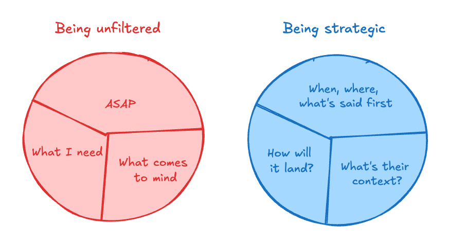 Don't confuse being direct with being unfiltered. Strategic communicators take the time to manage the when and how and prepare for how something will land.