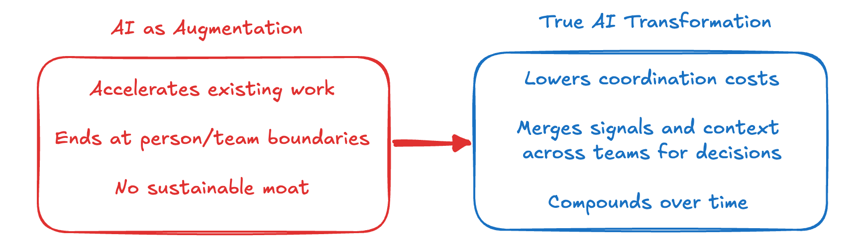 The challenge with only focusing on productivity gains is that while each function becomes more efficient within its own boundaries, the boundaries remain. A new learning from a sales call does not naturally affect marketing and product prioritization. A win in paid marketing does not change how sales prioritizes leads. The coordination and context transfer between marketing, sales, product, and customer success remains manual. There is time spent reconciling data between systems, reinterpreting insights across functions, and re-explaining context in recurring meetings. As teams grow, this drag compounds nonlinearly.